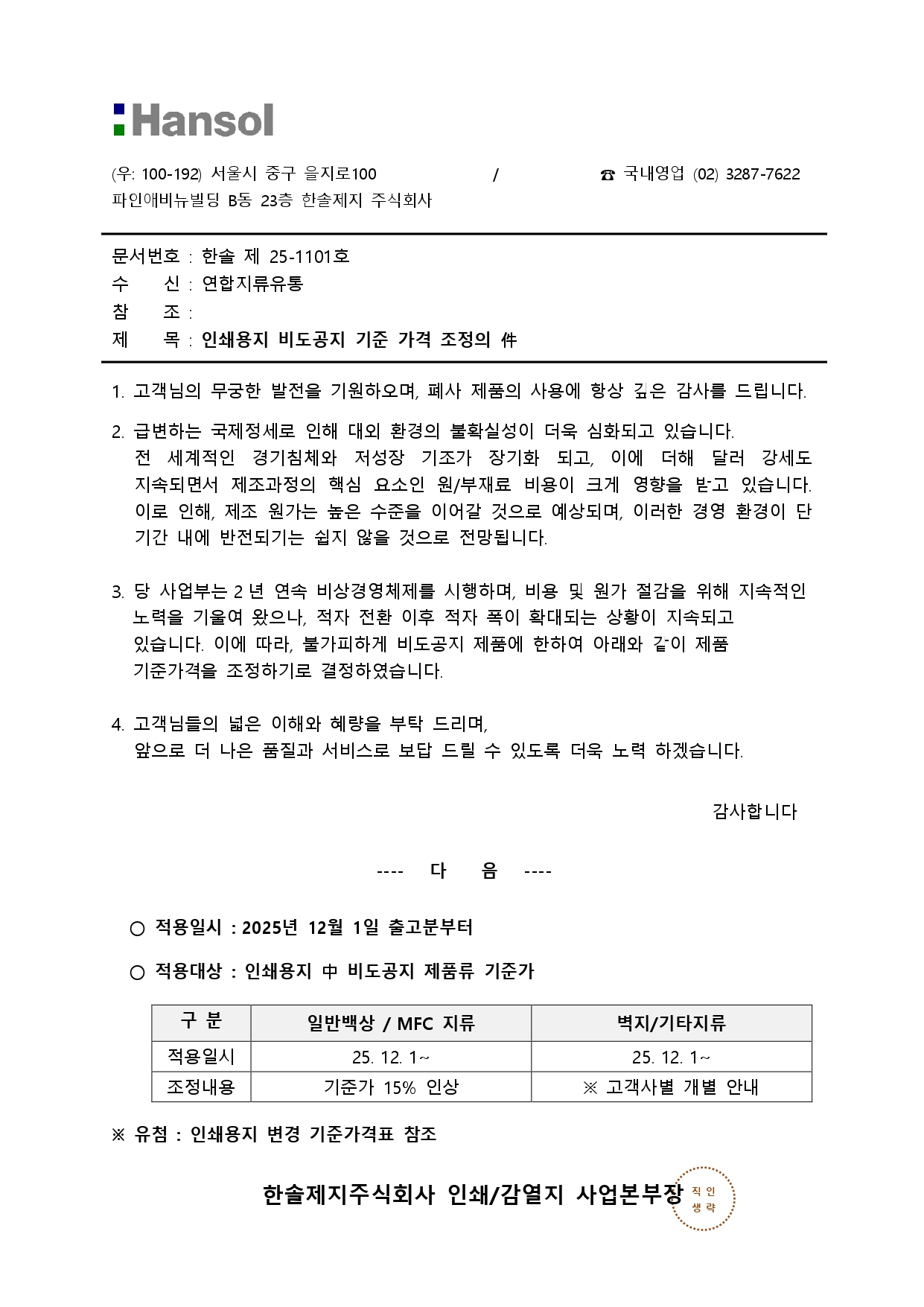 12월 1일부터 전체 종이값을 15% 인상한다는 공문을 보내왔습니다.